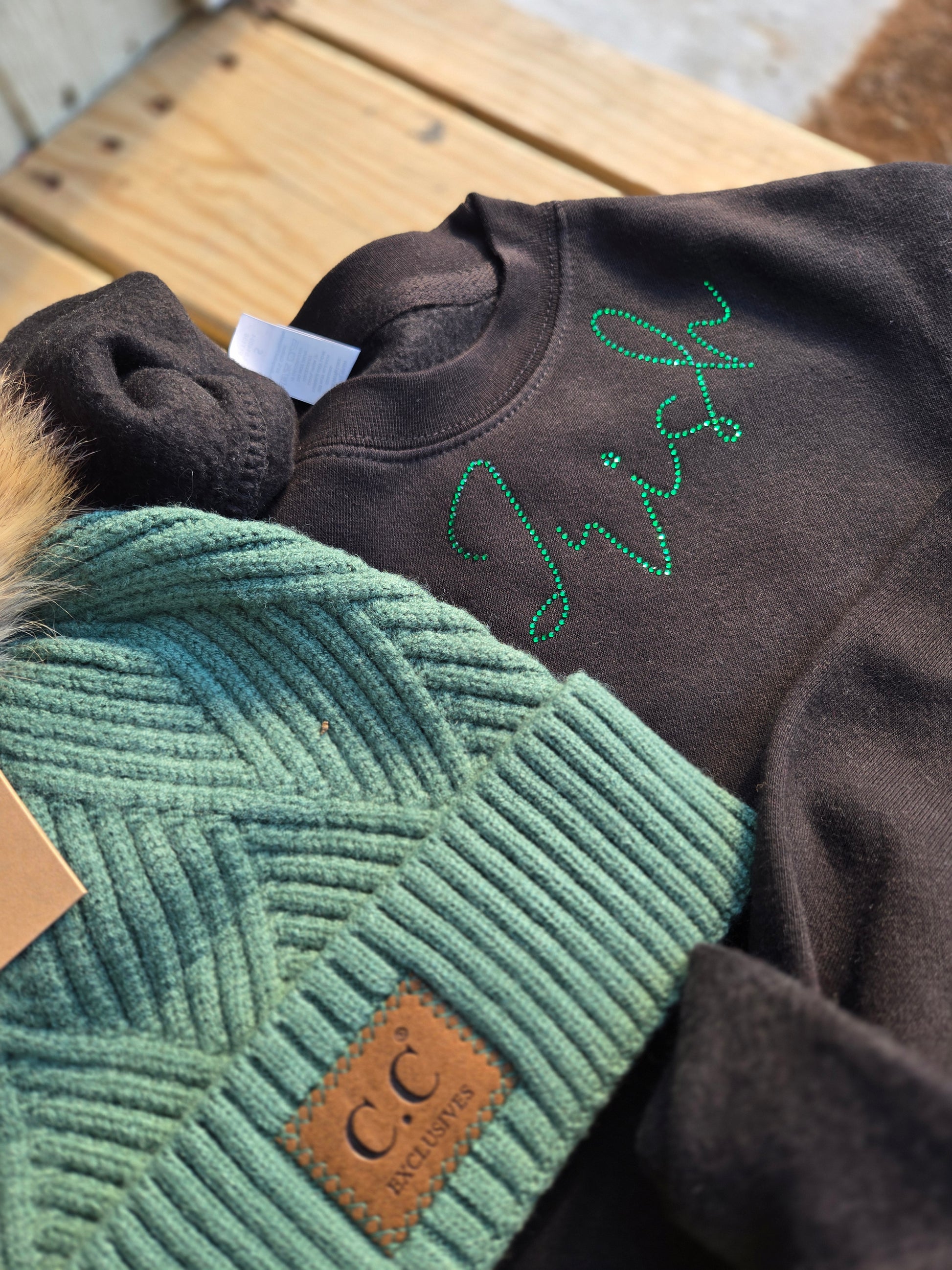IRISH SCRIPT Rhinestone Collar Black Crewneck Sweatshirt (ADULT)